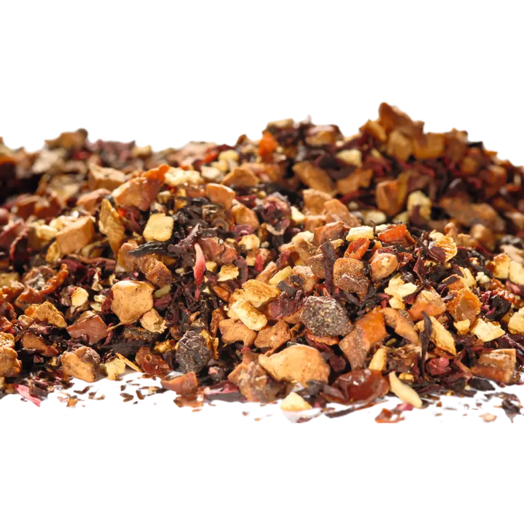 Apfelstücke, Hibiskusblüten, Orangenschalen (10%), Hagebuttenschalen, Rotbuschtee (4%), Korinthen, MANDELSTÜCKE, Aroma, Vanille.