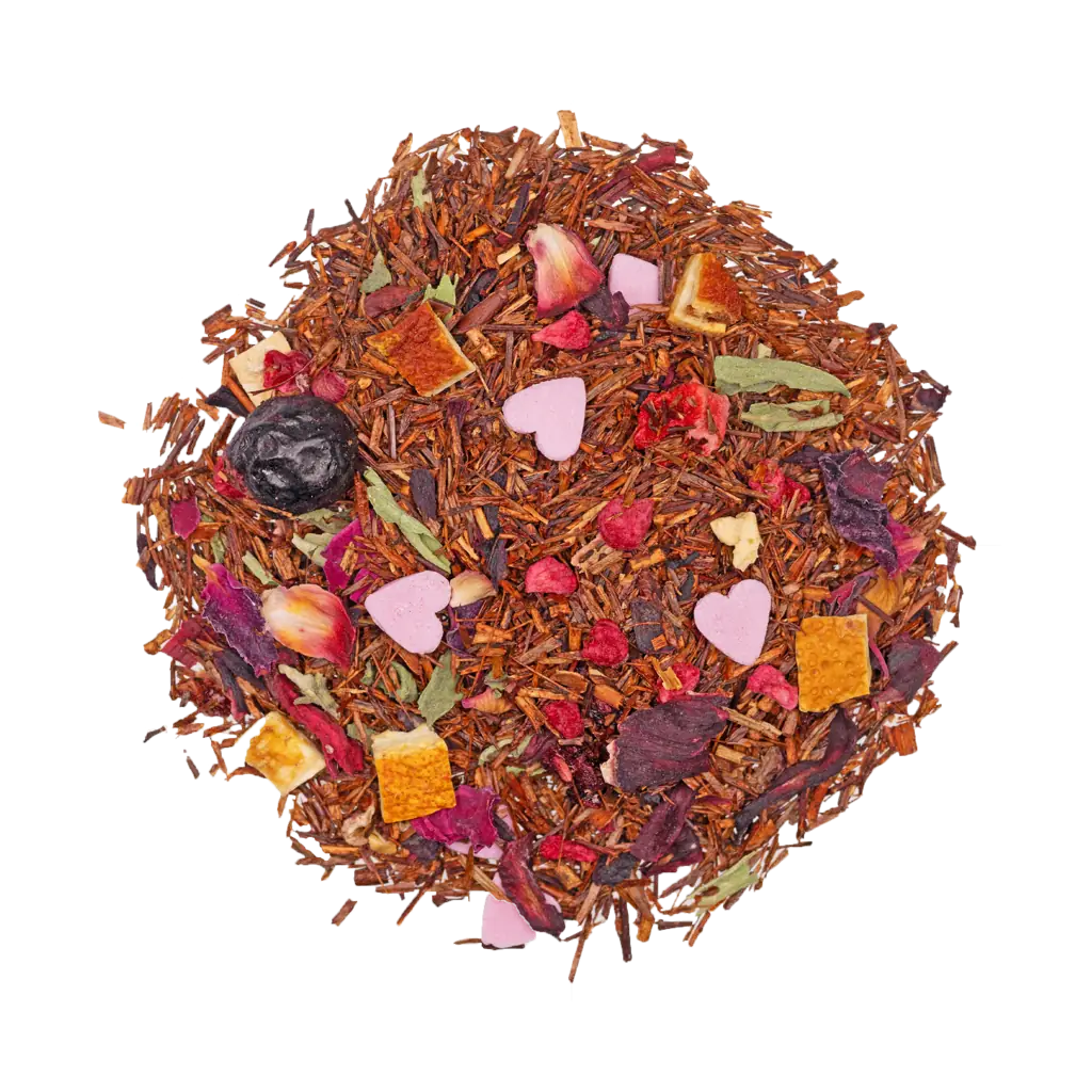 Rooibos, Hibiskusblüten, Aroma, Orangenschalen, Zuckerherzen (Zucker, Reismehl, Kakaobutter, Kartoffelstärke, färbendes Lebensmittel (rote Beete Saftkonzentrat)), Süßkraut, Erdbeerstücke, Himbeerstücke(1%), Rosenblütenblätter, schwarze Johannisbeeren(1%), Brombeerstücke